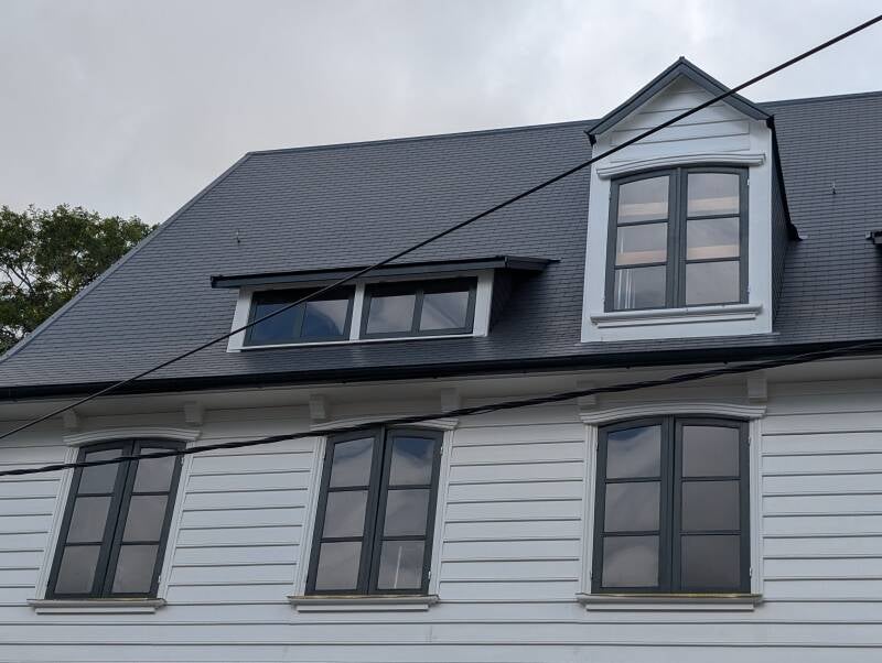Dak en Dakhuis: Het huis heeft een steile kap met drie verdiepingen en aan elke zijde van het dak staat een groot dakhuis met twee dakkapellen.